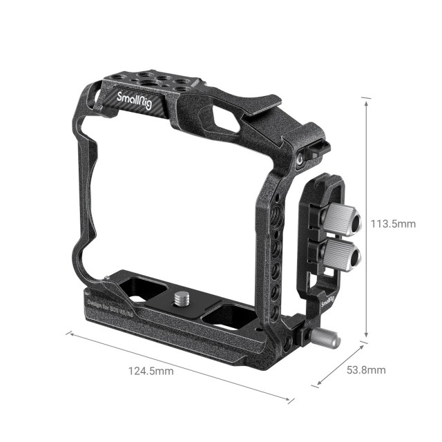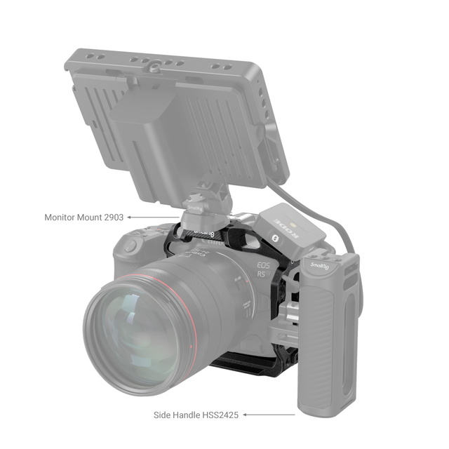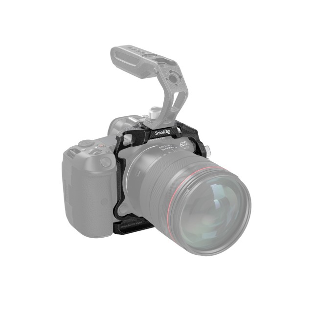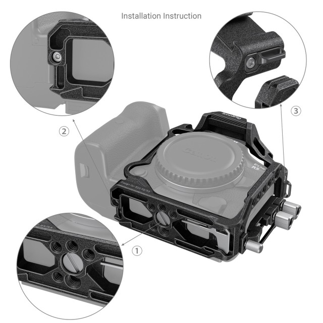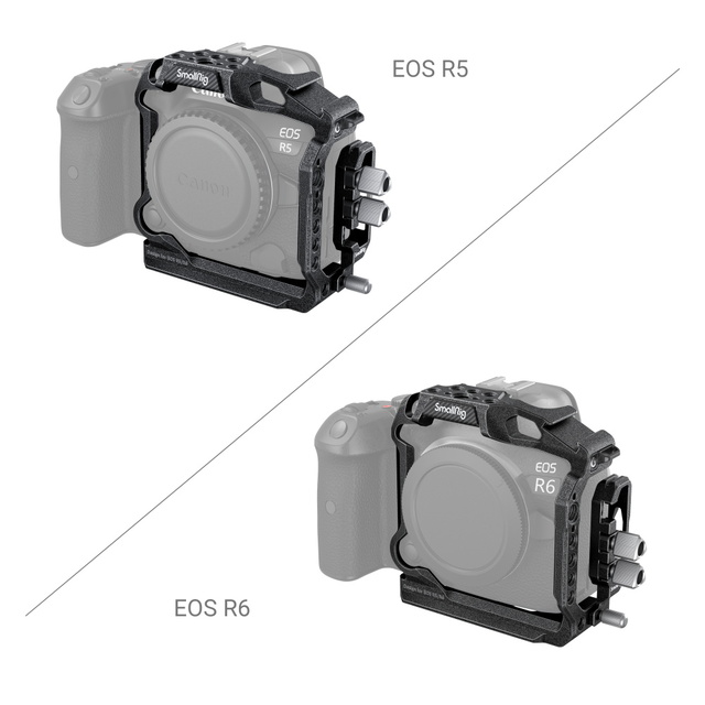 SmallRig “Black Mamba“ Half Cage & Cable Clamp for Canon EOS R5&R6 3656 is designed to leave the camera handgrip fully accessible and provide multiple accessory mounting points. The cage is locked with a 1/4" screw and a locating pin at the bottom and through the shoulder strap hole on the left side to prevent deflection. Silicone pads are built-in at several positions to protect the camera from scratches. The “Black Mamba” style is continued, maintaining full access to the camera's controls. the cage feature multiple 1/4"-20, ARRI 3/8" -16 locating holes, cold shoes mount to attach accessories like Side Handle 2093, Top Handle 1984, magic arm 2070, microphone, light, and hand strap PAC2456. Integrated Arca-Type base directly compatible with DJI RS 2 & RSC 2 Gimbal to realize quick switch among RS 2, tripod and handheld shooting, and Built-in spanner on the bottom helps remove screws. The attached hand-tight HDMI & USB-C cable clamp to prevent accidental disconnection and ensure stable signal;