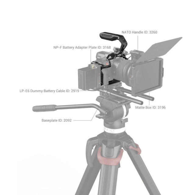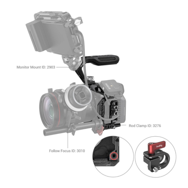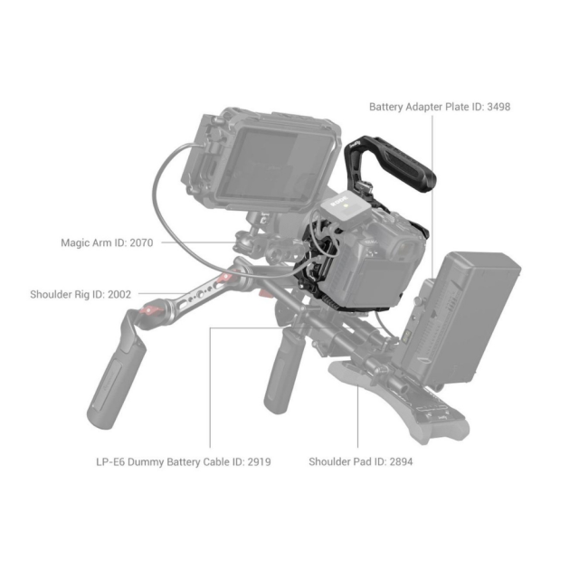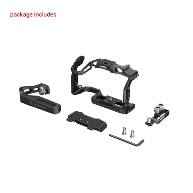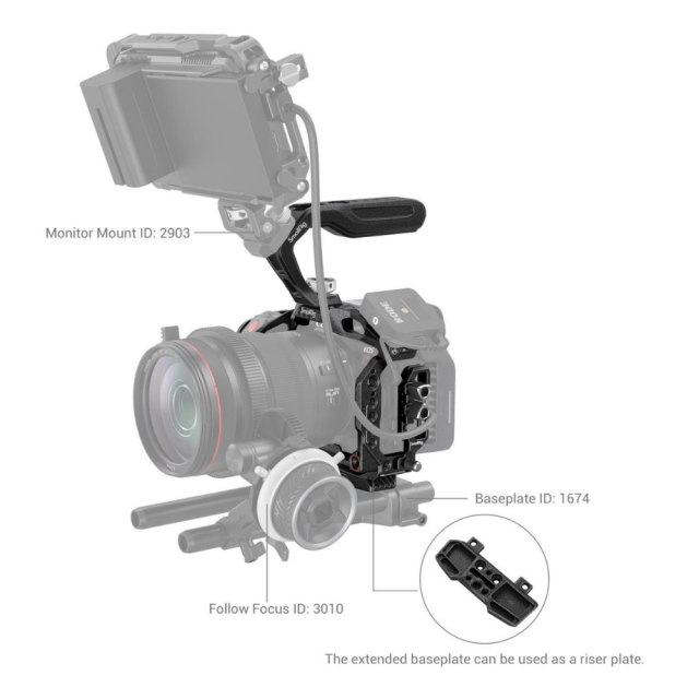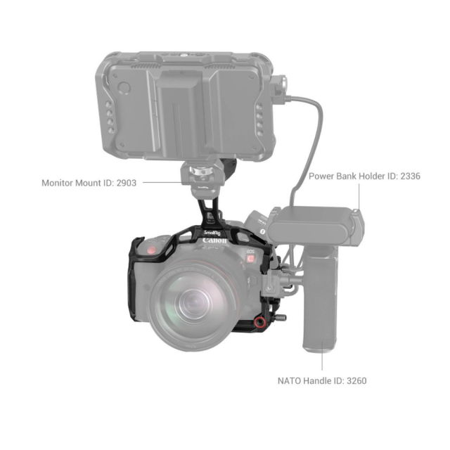 SmallRig “Black Mamba” Handheld Kit for Canon EOS R5 C 3891 is designed to protect camera, provide comfortable low-angle shooting experience and accessory mounts. It includes an ARRI top handle, a full cage and a dedicated cable clamp. The ergonomically-designed top handle feels comfortable and facilitates low-angle shot and camera movement; the “Black Mamba”-style cage, which fits EOS R5 C elements, gives full access to camera buttons and consists of a front cage and a detachable extended baseplate, combined to provide various shooting solutions. The kit comes with 1/4"-20 threaded holes, 3/8"-16 threaded holes, cold shoes, NATO rail for Side Handle 3260, Magic Arm 2070, Monitor Mount 2903, Battery Adapter Plate 3168, Portable Power Bank Holder 2336, microphone, LED light, etc; and a bottom Arca-Swiss plate, which supports DJI RS 2/RSC 2 and Arca-Swiss tripod, enabling quick switch among handheld, stabilizer, and tripod shooting. Its thumb-screw HDMI & USB-C cable clamp can prevent accidental disconnection and ensure stable signal transmission. Also, the cage includes a dual-head Allen wrench for easy assembly and disassembly.