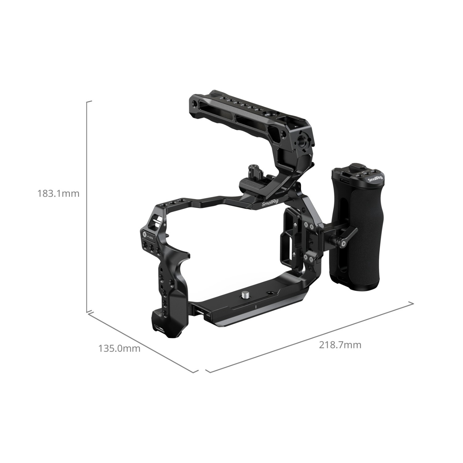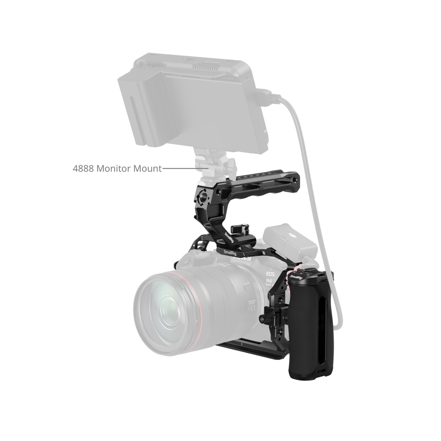 SmallRig Cage Basic Kit for Canon EOS R6 Mark III / R6 Mark II (Advanced Edition) 5956 is designed to reduce arm load and increase stability during handheld shooting, while offering a wide range accessory mounts. It includes a cage, a HDMI cable clamp, a top handle and a side handle.