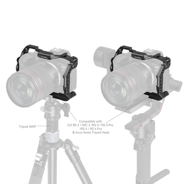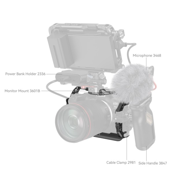 SmallRig HawkLock Quick Release Cage for Canon EOS R6 Mark II 4159B is designed to provide protection and attach accessories. It locks the camera via one 1/4"-20 screw at the bottom and one side lock adapter on both sides, with rubber pads preventing scratches. The cage maintains access to the camera button, card clot, screen, and battery door and comes with multiple accessory mounts. They include, among others, a 1/4"-20 threaded hole, 3/8"-16 threaded hole, and ARRI 3/8"-16 locating hole that supports Side Handle 2093 & 3814, Top Handle 3765, Monitor Mount 2903 & 2904, Manfrotto Bottom Plate 1280 & 2458, Holder for Portable Power Banks 2336 and mini V Mount Battery Plate 2987. 1/4"-20 locating holes on both sides fit Single Rod Clamp 3598 and Magic Arm 3873, and two 1/4"-20 threaded holes in the horizontal direction on the right side ensure stable vertical shooting.