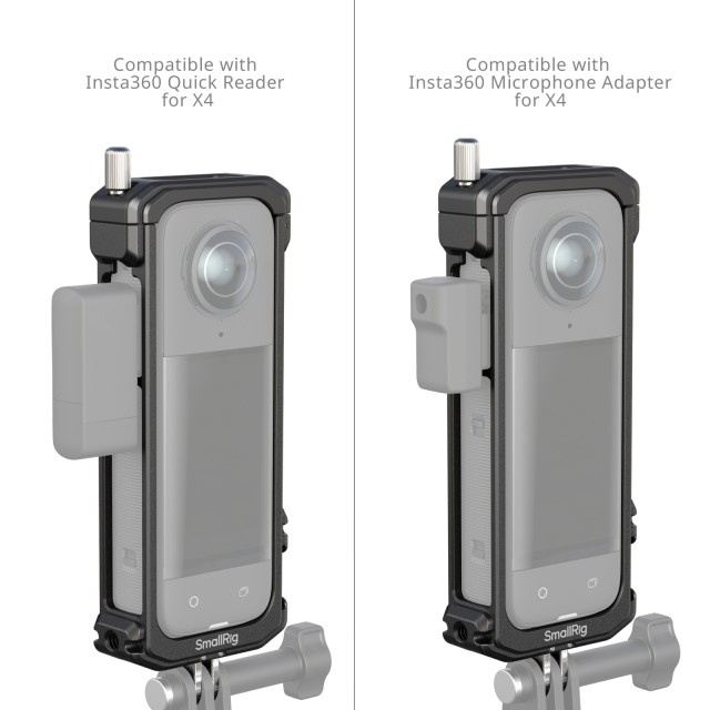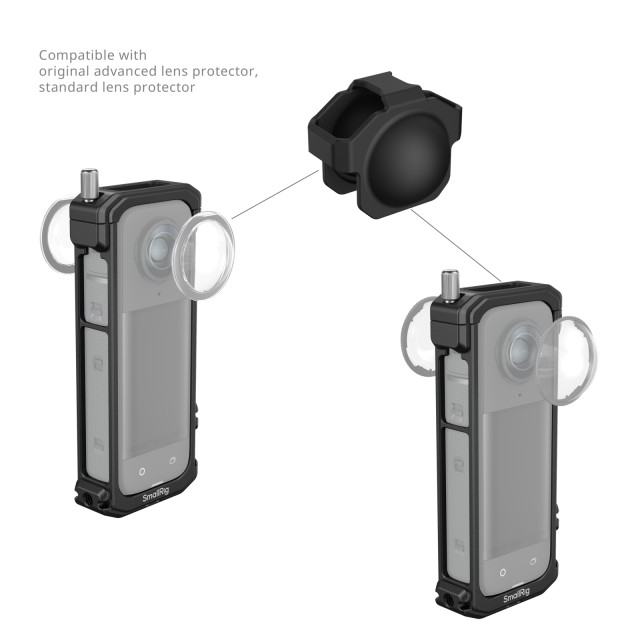 SmallRig Cage for Insta360 X4 4278 provides camera protection and a variety of interface expansion accessories for added convenience during shooting. Featuring a side-gap design, the cage provides unobstructed access to the battery door allowing for quick battery changes without disassembling the cage. The cage fits the action camera snugly, with inner silicone pads to prevent scratching the camera body. The camera is placed into the cage from the top and secured with a thumbscrew, requiring no tools for installation. The cage features a cold shoe mount and a 1/4"-20 anti-twist thread hole on the side for attaching microphones, LED video light, and other photography accessories. The bottom action camera interface can be folded for storage, and it also features a 1/4"-20 thread hole for direct attachment of 1/4"-20 screw tripods, selfie sticks (4758), and more. Comes with a silicone lens cap for lens protection during storage.