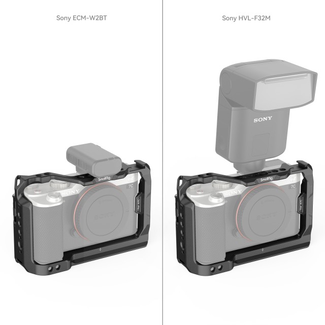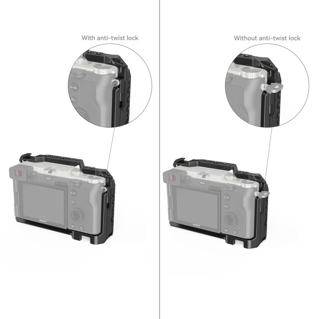 SmallRig Cage for Sony Alpha 7C 3081B is designed to provide mounting points for accessories like monitors, microphones, and LED lights in professional video shooting. The cage secures to the camera with a 1/4"-20 screw at the bottom. To further prevent twisting, can also use the right side lock by pushing up the slider and securing the attached small screw to the strap hole of the camera.