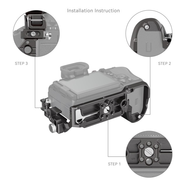 Note: Please remove the shoulder strap ring on the left side of the camera before mounting the cage.