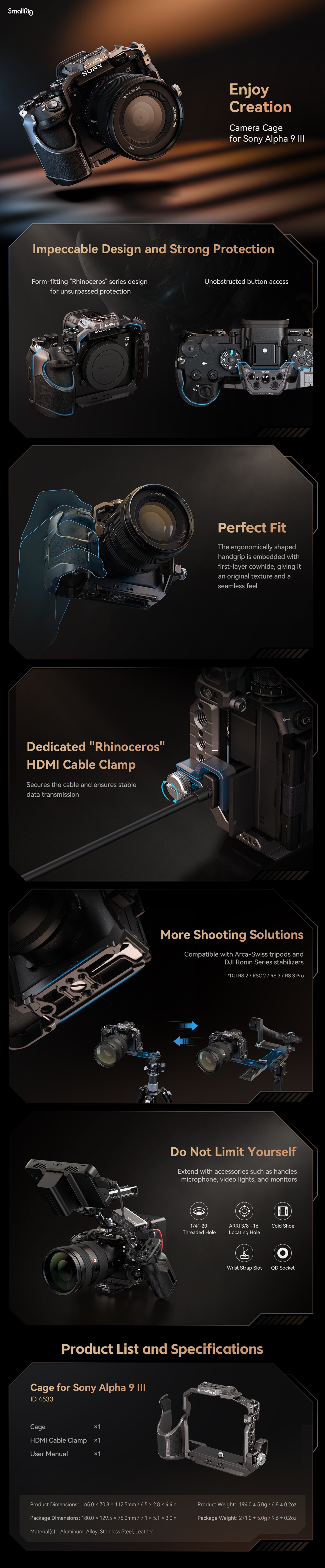 SmallRig Cage for Sony Alpha 9 III 4533 is designed to provide camera protection and expansion with accessories. Three-point anti-deflection locking system firmly secures Alpha 9 III via locating pins, a 1/4"-20 screw on the bottom, and an M2.5 screw on the left. The streamlined cage design ensures unobstructed button access, providing a more convenient usage experience. The dedicated "Rhinoceros" HDMI Cable Clamp secures the cables with thumbscrews protecting HDMI ports and ensuring stable data transmission. Multiple built-in mounting interfaces include 1/4"-20 holes and ARRI 3/8"-16 locating holes to attach a top handle (ID: 2165C) or side handle (ID: 4016), ARRI 3/8"-16 locating hole to expand the monitor support (ID: 2903B), cold shoes for microphone or LED video light, QD socket for QD shoulder strap. The built-in Arca-Swiss quick-release plate at the bottom is compatible with DJI RS 2 / RSC 2 / RS 3 / RS 3 Pro, DJI RS 2 / RSC stabilizer with quick-release plates, and Arca-Swiss quick-release plate (ID: 3154). The strap holes on the left and at the bottom of the cage are compatible with the hand strap (ID: 3848), shoulder strap (ID: PSC2428), and other accessories. Besides, a magnetic wrench at the bottom of the cage is accessible at any time for easy disassembly and assembly.