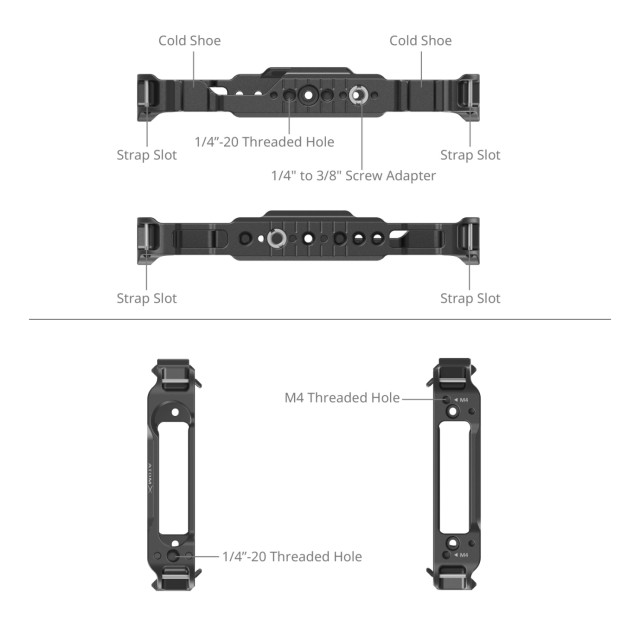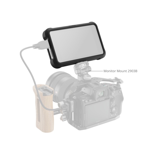 The cage (ID CMA2209B) is equipped with a built-in slider to quickly attach accessories like magic arms (ID 2071B) and monitor mounts (ID BSE2385). It also features 1/4"-20 threaded holes to rig up monitor mounts (ID 2903B) and magic arms (ID 2070B), along with ARRI locating holes for magic arms (ID 2115C). The built-in cold shoe is compatible with wireless microphones, transmitters, and more. Additionally, it has strap holes on the top and bottom for attaching a shoulder strap. The kit provides a dedicated HDMI cable clamp that features an SSD anti-detachment design to prevent accidental disconnection of large Atomos SSDs to secure connections and maintain stable signal transmission.