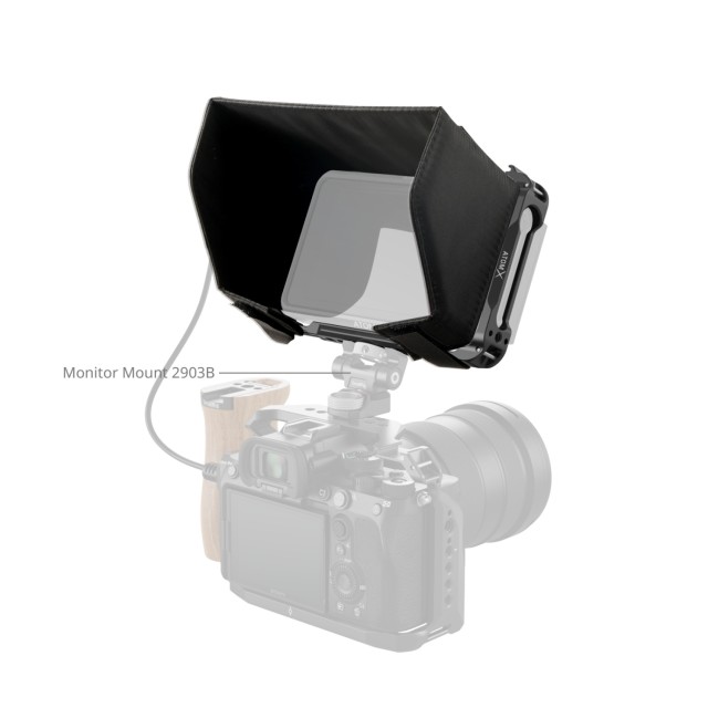 1. When using the original sun hood from the Atomos Ninja series, begin by installing the sun hood, followed by the cage (ID CMA2209B).