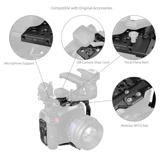 Customize your Canon EOS C80 rig with the SmallRig Cage Kit 5136—a modular cage system designed for maximum flexibility and accessory support. Its plates can be configured to suit both tripod and gimbal setups, while multiple 1/4"-20 and ARRI 3/8"-16 threads, NATO rails, a cold shoe mount, and a QD socket provide expansive mounting options. The included Arca-Swiss quick release base, HDMI cable clamp, and top handle with NATO clamp enhance both usability and handling. An adjustable lens adapter support ensures extra stability when using heavier lenses, making this cage a robust solution for professional video production.