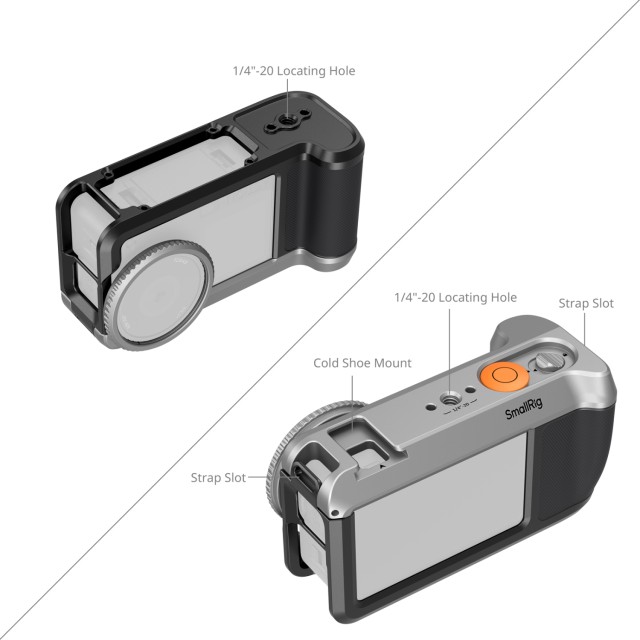 The open-bottom design reserves access to the camera’s built-in dual-direction magnetic quick-release interface. An additional threaded mount at the base is compatible with optional SmallRig quick-release plates (using the same interface as the DJI Osmo Action 6), helping to protect your device’s quick-release mount from wear. For further assistance, please consult customer support.