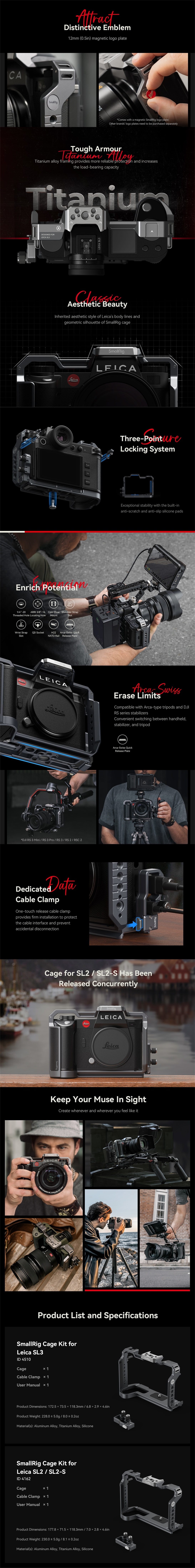 SmallRig Cage Kit for Leica SL3 4510 is designed to protect the camera and expand your camera with accessories to facilitate your creativity. The three-point locking system fixes the camera through one 1/4"-20 screw at the bottom and two side lock adapters. The built-in silicone pads prevent the camera from scratches. All of the load-bearing parts are made of titanium alloy, making the cage kit robust and durable and giving unobstructed access to all of the camera interfaces. The cage kit features multiple mounting interfaces.