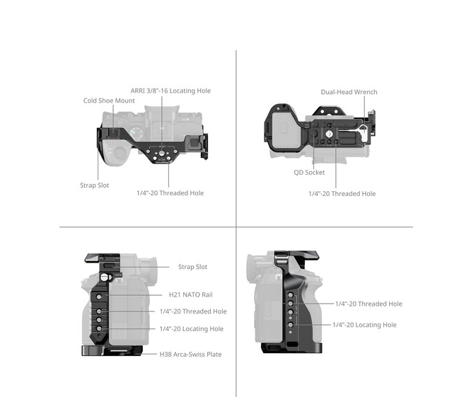 Constructed from durable aluminum alloy and stainless steel, the formfitting cage protects your camera while maintaining full access to ports, controls, and battery compartment through a smart hinged design. Dual locking side plates ensure the camera stays firmly in place without twisting. The cage features multiple 1/4"-20 and ARRI-style 3/8"-16 anti-twist threads, a NATO rail, QD socket, strap slots, and dual cold shoe mounts, offering extensive options for mounting accessories such as monitors, microphones, and lights.