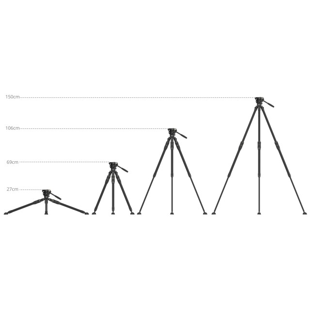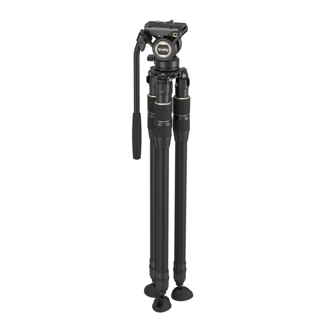 SmallRig Carbon Fiber Tripod Kit FT-S303 4643 is a carbon fiber tripod designed for professional outdoor videography. The legs feature a FreeSpeed-Twist quick-tightening design, allowing for easy and efficient setup by tightening double knobs to lock all three sections. Operating Altitude ranges from 27cm (10.6in) to 150cm, and a compact storage length of 74cm (29.1in). The use of a 30mm diameter for the legs ensures a lightweight design without compromising stability and load-bearing capacity. This tripod, featuring a built-in bubble level, works with a 65mm bowl base for leveling and easy management of frame level. The kit includes a compact fluid head, featuring a damping system, that allows you to pan the camera smoothly. When its center of gravity height is put at 50mm, the panning, and pre-set fixed counterbalance system can help precisely control the camera or other rigs weighing up to 4kg for great counterbalance. The video head can carry as much as 6kg. It has a newly designed snap-on quick-release plate mount, a more efficient mounting solution than traditional slide-on ones, which is DJI RS series quick-release plate and 501PL quick-release plate compatible to realize a free switch between stabilizer shooting and tripod shooting. The kit also features 1/4"-20 and 3/8"-16 threaded holes for attaching accessories like magic arms, along with a built-in flat head screw for convenient camera installation and removal. It weighs only 2.9kg.