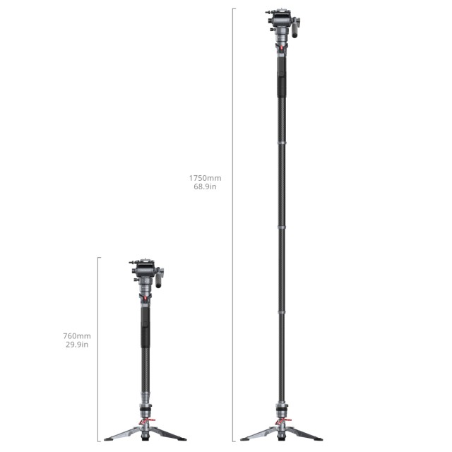 SmallRig Carbon Fiber Video Monopod 5565 provides stable support for photographers working in tight spaces or on the move. The top features a 1/4"-20 screw for connecting and expanding setups, while the base includes dual 1/4"-20 and 3/8"-16 screws for broad compatibility with various photography and videography equipment. It reaches a working height of 1750mm / 68.9 in to meet diverse shooting needs, yet collapses to just 76cm / 29.9 in for easy transport, weighing only 2500g / 5.51 lb. Three 1/4"-20 mounting holes allow for additional accessories like magic arms.