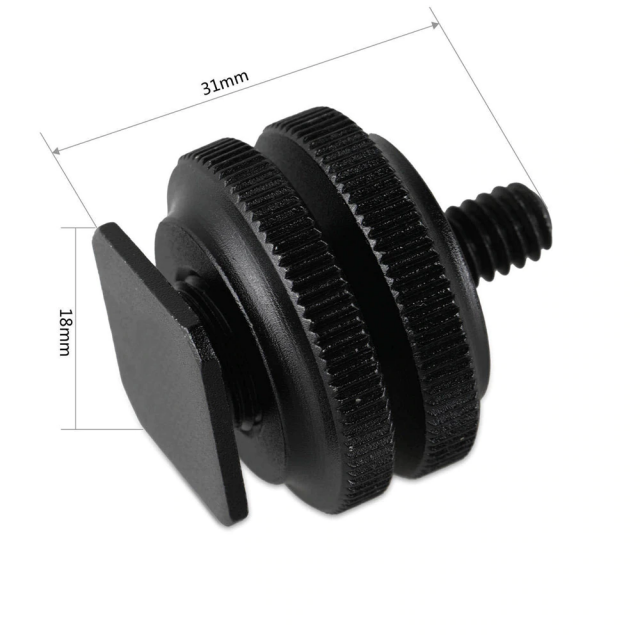 The Hot Shoe Adapter 3/8" to 1/4" is part of the CoolArm11, and may be used to mount an accessory with 1/4" socket to the hot shoe of a camera. The thread is 3/8" to 1/4": the thread top part is 1/4" , bottom part is 3/8". Includes: 2x Shoe Mount Adapter Material: Aluminum Alloy Net Weight: 60g