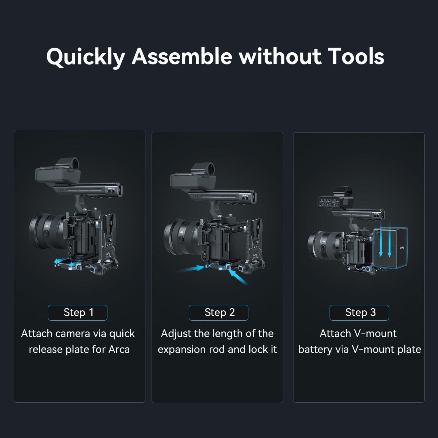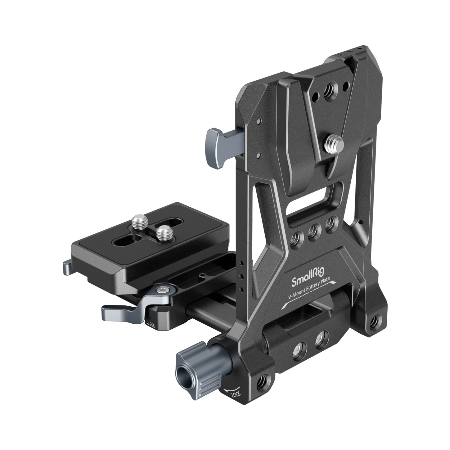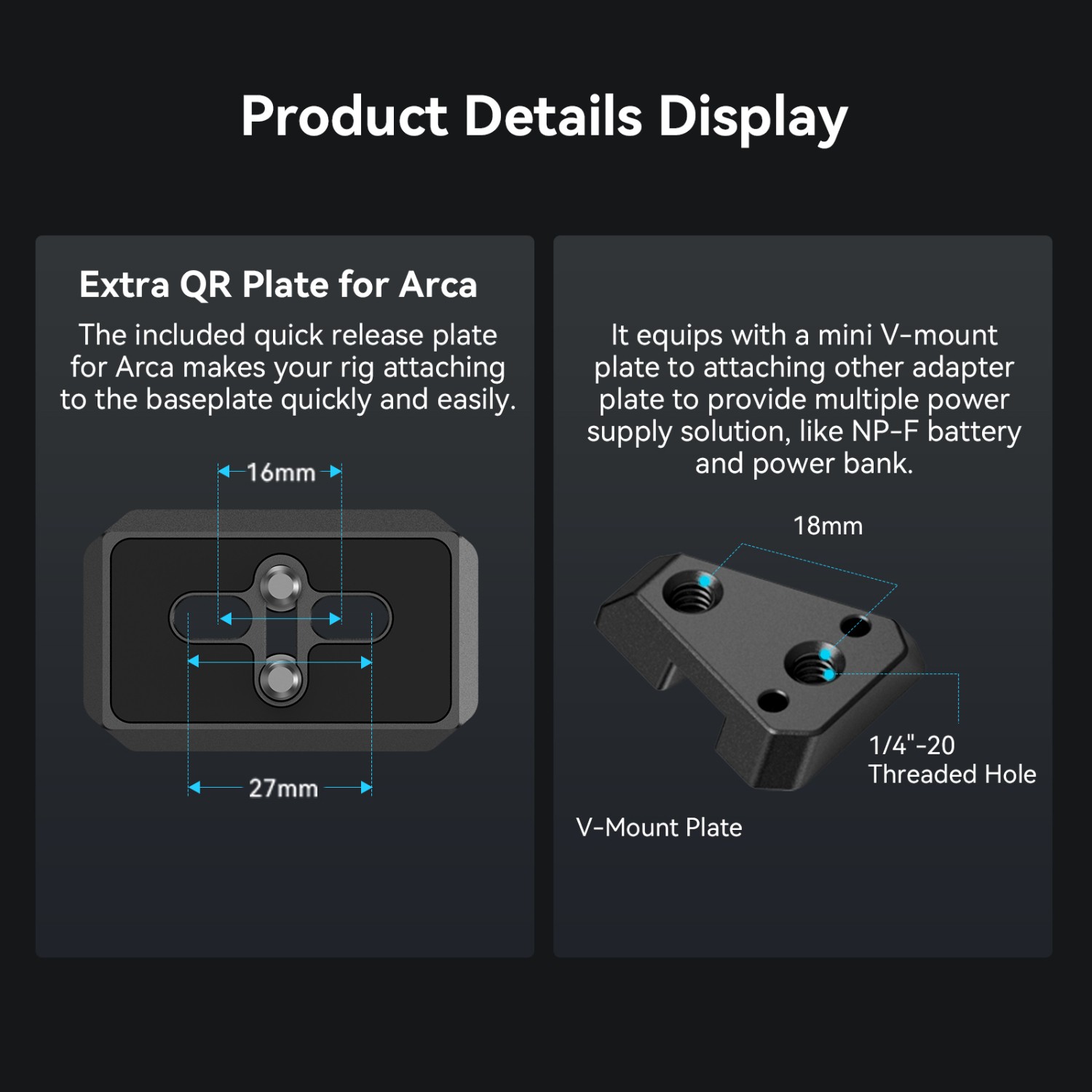 SmallRig Compact V-Mount Battery Mounting System 4064 represents a compact, lightweight, convenient, all-in-one mounting solution for V-mount battery. The kit consists of a V-mount battery plate, an Arca-type quick-release plate, and a V-mount plate. Particularly, the baseplate can be stretched to fit mirrorless / DSLR cameras of various sizes, which is helped by tool-less installation and adjustment, quick and time-saving. Beyond any cage with a built-in Arca-type plate, it can directly support the camera and DJI RS series gimbals via the Arca Swiss quick-release plate. The V-mount battery plate, featuring 1/4"-20 threaded holes and a V-mount plate, provides more power supply solutions by attaching NP-F Battery Adapter Plate Professional Edition 3168 or Holder for Portable Power Banks BUB2336. Switching between handheld shot and tripod shot is also easier, thanks to the bottom Arca-type plate. The 90-degree rotatable V-mount battery plate leaves enough room for flip screen, with pivot dampening preventing your device from falling. It can be folded down for increased compactness and portability.