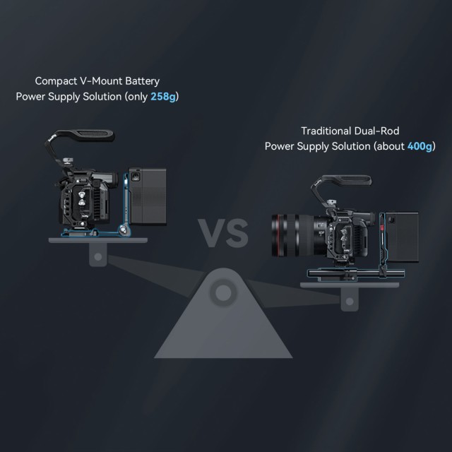 1. Compact, lightweight, all-in-one mounting solution to V-mount battery