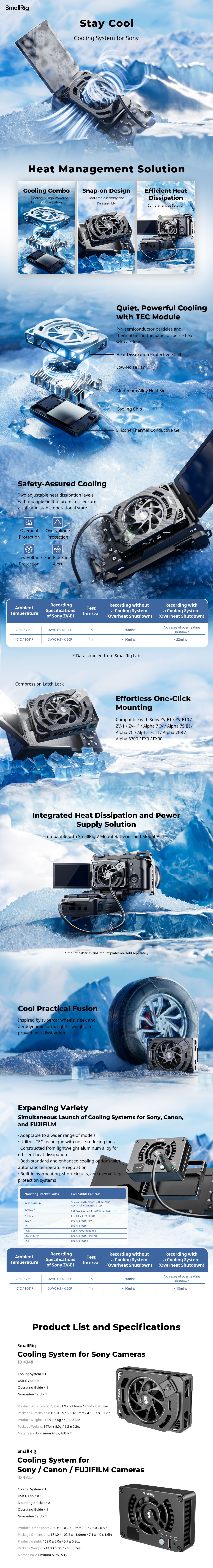 SmallRig Cooling System for Sony / Canon / FUJIFILM Cameras 4815 is designed to cool down Sony mirrorless cameras and enhance the recording duration of high-specification videos. The cooling system utilizes a high-efficiency fan with a TEC cooling module to quickly cool the camera and effectively alleviate overheating problems. Built-in intelligent temperature control design, the cooling system automatically adjusts the cooling system power according to the temperature of the contact surface between the cooling system and the camera, easy to use. Snap-on mounting design, easy to remove and install, compatible with more models. Can be used with or without a camera cage, and it is lighter and freer to use. The cooling system is compatible with V-Mount Battery Mount Plate Kit 4064B / 4063B, with V-Mount battery 3579 / 3580 / 4292 use, heat dissipation, and power supply without worry.