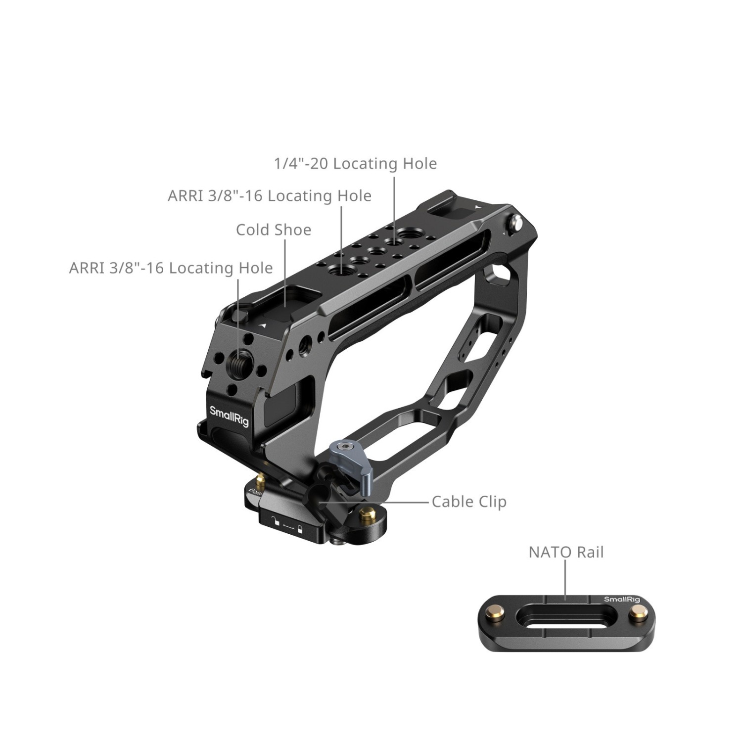 Equipped with multiple mounting interfaces—including 1/4"-20 locating holes, cold shoe mounts, and ARRI 3/8"-16 locating holes—this top handle seamlessly integrates with accessories such as the monitor mount (ID 2903B), magic arm (ID 4194), and microphones, ensuring versatility for various shooting scenarios.