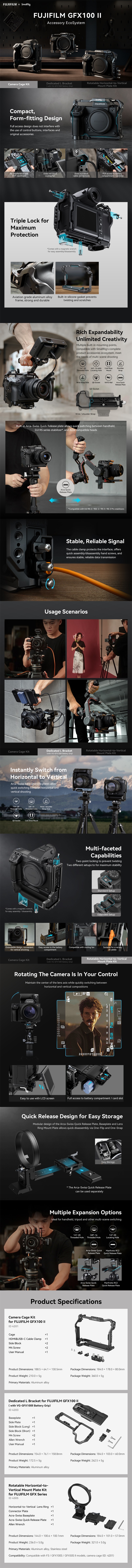 SmallRig Dedicated L Bracket for FUJIFILM GFX100 II with VG-GFX100ll Battery Grip 4203 facilitates quick switch between horizontal and vertical shooting. It locks the camera via one 1/4"-20 screw at the bottom and one side lock adapter on the left and comes with two side lock adapters (standard setup / extended setup). In vertical shooting, the side plate…