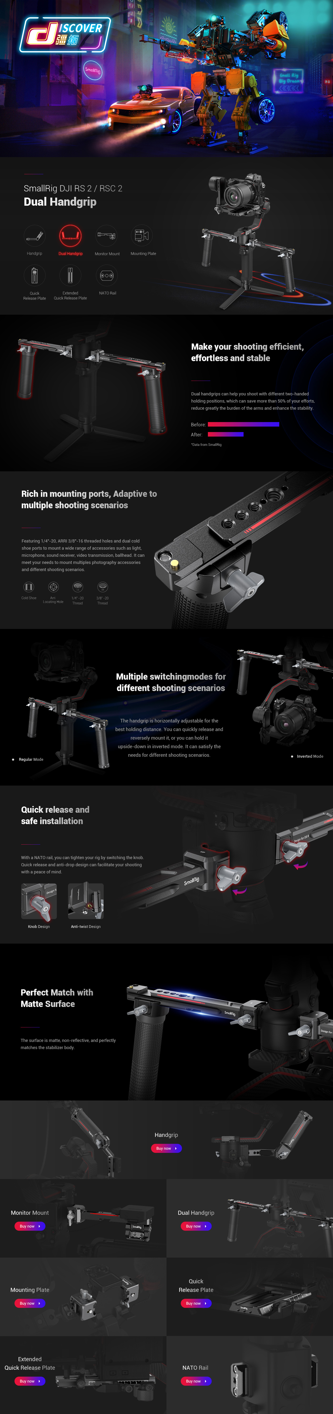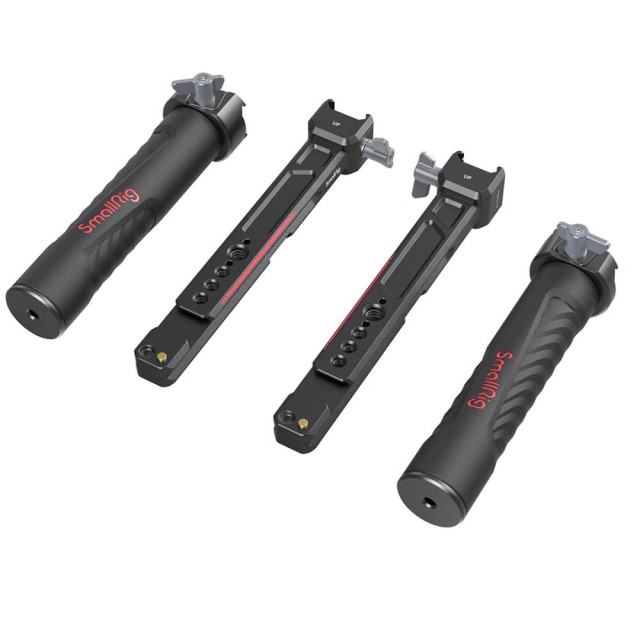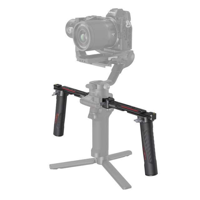 SmallRig Dual Handgrip for DJI RS 2 / RSC 2 / RS 3 / RS 3 Pro / RS 4 / RS 4 Pro 3027 is designed to reduce arm fatigue during shooting and provide rich accessories mounts. It secures to the NATO rail on each side of the gimbal, easy for detachment and time-saving. The handgrip is designed with two-side NATO rails, which is not only horizontal adjustable, but also easy for detachment and support shooting in inverted mode. Built-in multiple 1/4”-20 and ARRI 3/8”-16 threaded holes can attach Magic Arm 2115 for monitor. Cold shoe ports can be used for Monitor Mount 2905, wireless go, microphone, sound receiver, etc. It disassembles into four part for easy storage and transport.