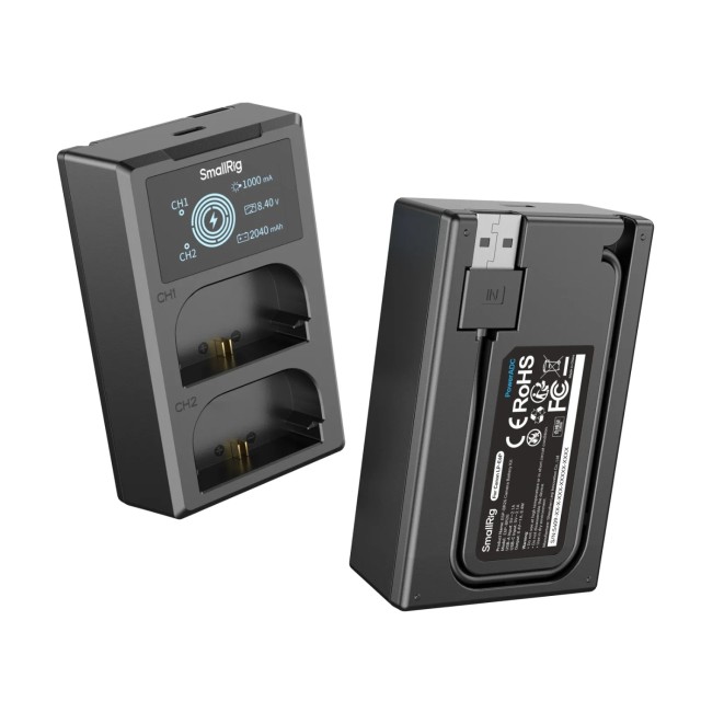 Each battery delivers a true-rated output of 2520mAh, providing extended shooting time for demanding workflows. The charger is equipped with two independent slots, allowing for the simultaneous charging of two batteries or a single battery, optimizing efficiency for multi-battery setups. An intelligent LCD display provides real-time monitoring of charging current, charging voltage, charge progression and accumulated power input. Additionally, the charger incorporates both USB-A and USB-A input ports, making it compatible with wall adapters, car chargers, and power banks for versatile charging options.