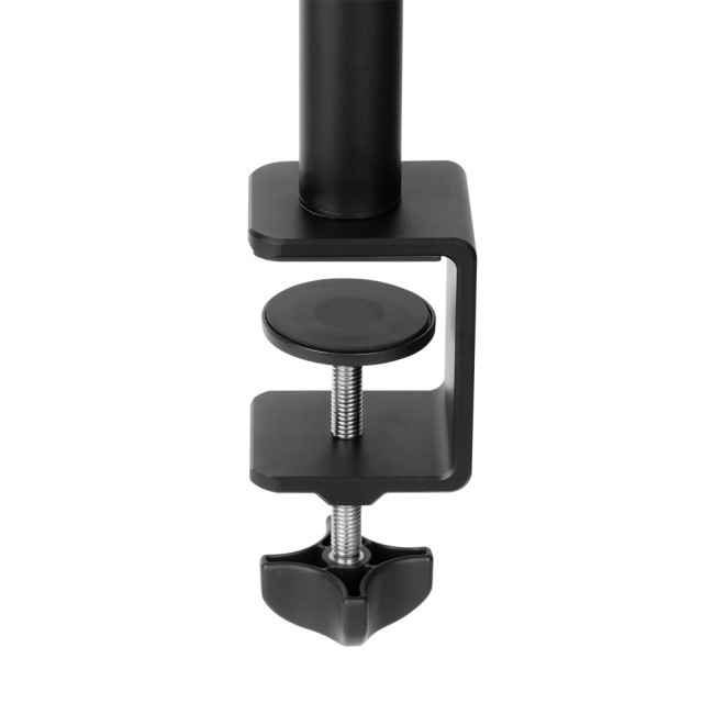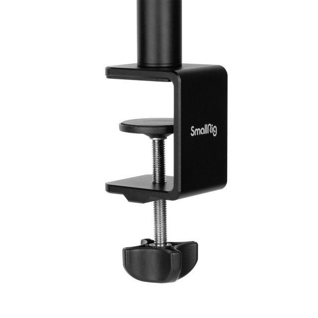 SmallRig Encore DT-30 Desk Mount with Holding Arm 3992 is mostly used for photography, videography, live streaming, vlog shooting, makeup, selfie, etc. Made of strong, durable aluminum alloy, the anti-rust stand features easy-to-clean, anti-fingerprint frosted surface. Designed with 3 extension rods that can extend up to 1m of working height. The mount is anodized and CNC machined, and also comes with a 360° rotating removable ball head (Φ22mm) and bears a load of 3-10KG. The 1/4" screw on the top ensures a 360° swivel for panorama shooting and -90°/+45° tilt for multi-angle shooting without disassembling the devices. This mount fits up to 5cm / 2" thick desks, making it more space-saving than a light stand. Its 355mm long aluminum alloy holding arm, with a load capacity of 2KG, has a Φ18mm ball head and a 1/4" screw on the top for attaching LED light, microphone, smartphone, etc.; the attached ring light adaptor perfectly works with DSLR camera, smartphone, ring light, panel light, etc.