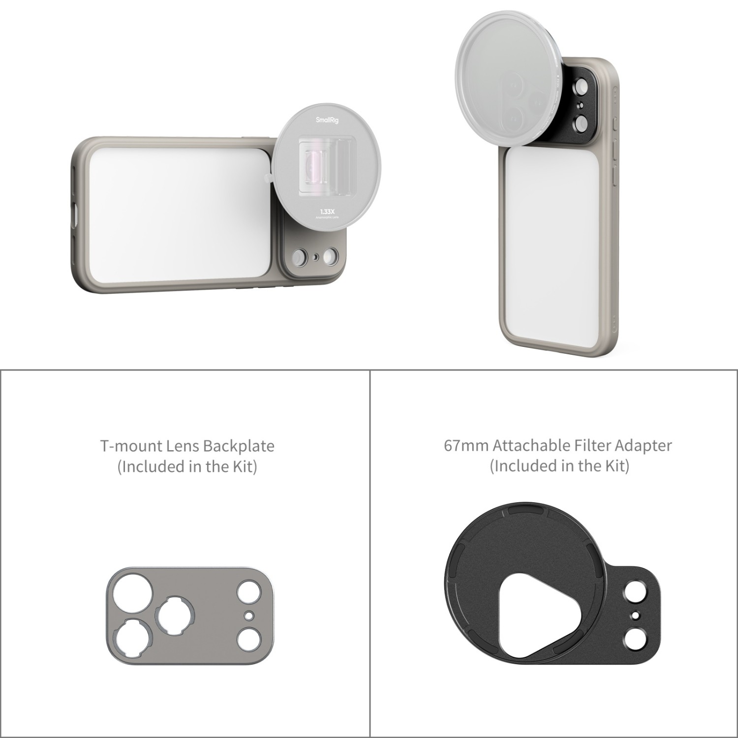 It features a quick release lens backplate system that includes T-Mount Lens backplates and 67mm Attachable Filter Adapters for rapid lens and magnetic filter changes. The case is made of soft TPU material, providing a comfortable grip while offering basic protection for the corners and edges of the phone.