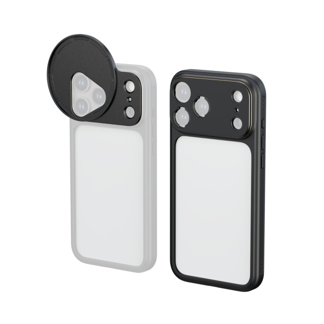 It features a quick release lens backplate system that includes T-Mount Lens backplates and 67mm Attachable Filter Adapters for rapid lens and magnetic filter changes. The case is made of soft TPU material, providing a comfortable grip while offering basic protection for the corners and edges of the phone.