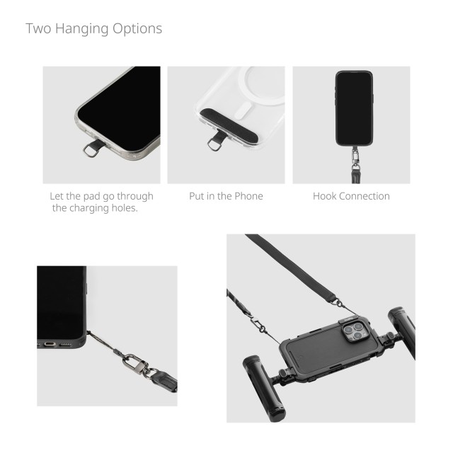 The package includes two lanyards and one tether pad for easy attachment to phone cases, compatible with all full-body cases or those with lanyard holes. Two hanging options are available: 1) Attach the hook or lanyard to the tether pad after inserting the pad into the charging port slot and securing the phone to the case. The ultra-thin pad will not obstruct plug-in charging. 2) Attach the lanyard directly to the case using the lanyard hole. Additionally, two lanyards can be used to hang phone cages, offering more versatility.