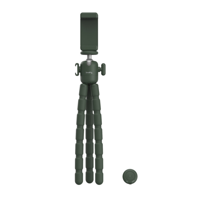 SmallRig Flexible Vlog Tripod with Wireless Control VK-29 (Green) 3991, made of nylon with fiber, aluminum alloy, and TPE, looks smart and is designed with user friendly. Containing 12 intertwining aluminum alloy wires and wrapped with high-elasticity TPE, its legs can be bent at will. Among its accessory mounts, the cold shoe mount on the side fits such accessories as LED light and microphone; and the top 1/4"-20 screw allows attaching smartphone, mirrorless camera, and action camera. The ball head swivels 360° and supports a quick switch between horizontal and vertical shots. This item features folded length of 270mm and load capacity of 2kg.