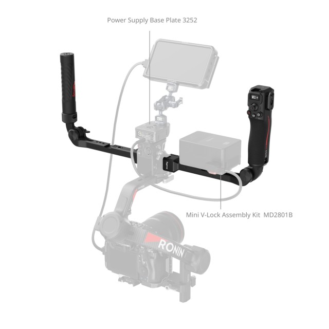 The handles feature various mounting options, including 1/4"-20 threaded holes, 3/8"-16 locating holes, a cold shoe mount, a NATO rail, a QD socket, and strap slots. This allows for the attaching of V-mount battery plates (ID 2988), providing a long-lasting power supply for both the stabilizer and the camera. The handles support inverted use and offer flexible angle adjustment for effortless shooting.