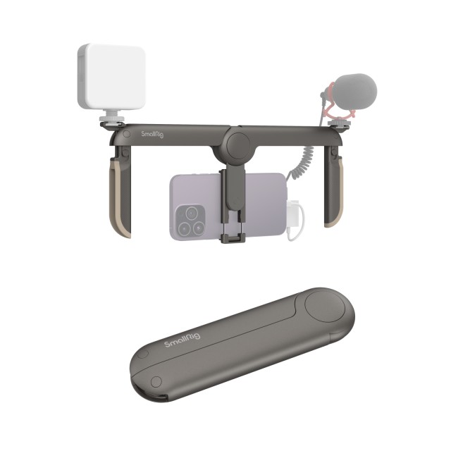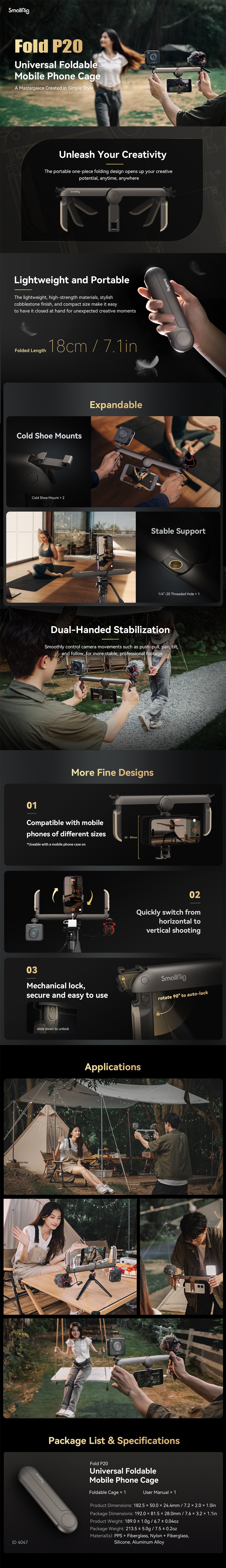 SmallRig P20 Universal Foldable Mobile Phone Cage 4047 is beautifully crafted, which can be used for dual-handed photography and folded to just 18cm long to be daily carried around. Looking like a pebble, the cage feels smooth and comfortable. As for its cross arm, there is a foldable cold shoe mount on each end for a microphone and LED video light; and a 1/4”-20 threaded hole at the center for accessories like a tripod. Its grip handles, which can be stored in the cross arm, feature silicone edges for a more comfortable grip; and like the cold shoe mounts, can be mechanically locked to increase solidity and durability. This item supports 65-80mm wide mobile phones (with cases) in horizontal and vertical shooting.