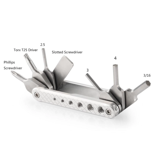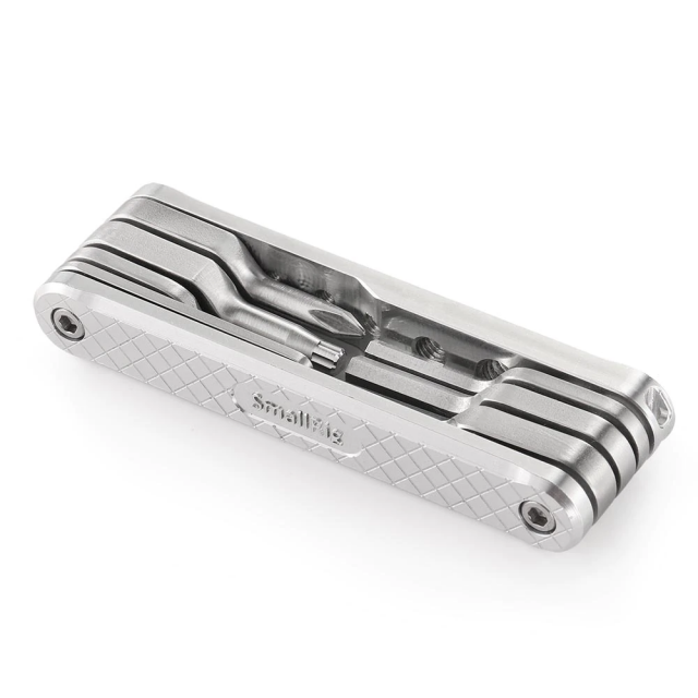 SmallRig Folding Tool Set with Screwdrivers and Wrenches 2213 is a pocket-sized folding multitool designed for video photographers. It is compact and easy to be carried around, preventing loss of tiny wrenches and screwdrivers. The wrenches and screwdrivers are made of solid stainless steel, and the side plates are made of robust aluminum alloy. It comes with 4 Allen Wrenches 2.5, 3, 4, 3/16, 1 slotted screwdriver, 1 Phillips screwdriver and 1 Torx T25 driver, covering the needs of most shooting scenarios. Besides, there are additional threaded holes M2.5, M3, M4, M5, 1/4 on the side for storing spare screws.
