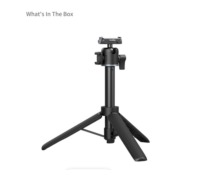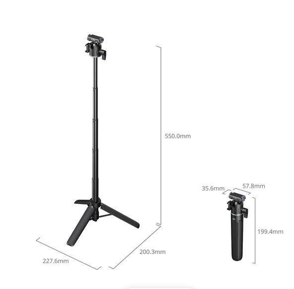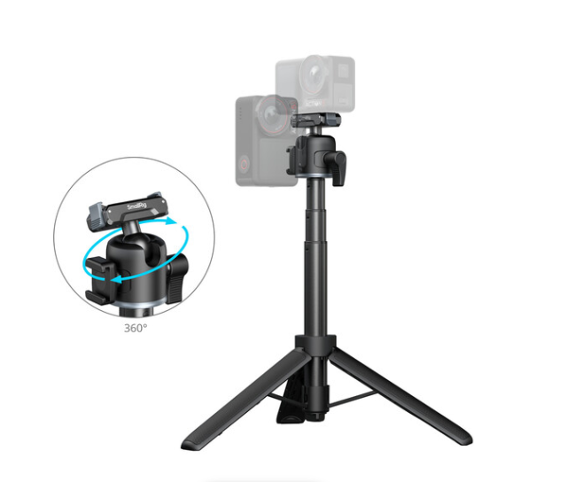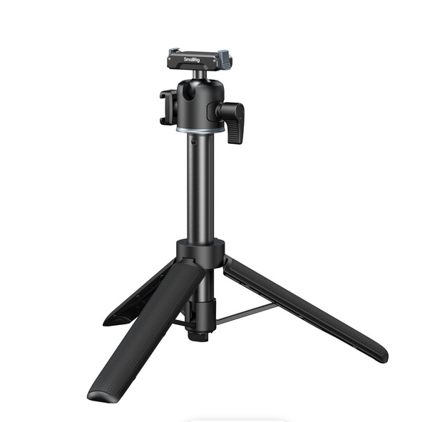The SmallRig Telescoping Handgrip/Tripod is a multi-functional, ultra-portable support system designed specifically for lightweight action cameras such as GoPro HERO and DJI Action series. Its 4-section telescoping pole extends smoothly from a compact 7.9" to a full 21.7" working height, offering flexible handheld reach or stable tripod positioning. The collapsible mini tripod base folds flat for pocketable storage, while the included ball head provides full 360° pan and 90° tilt via a secure 1/4"-20 screw mount. A quick-release action camera clamp allows instant attachment and detachment without tools, and silicone padding ensures scratch-free security. Built from durable aluminum, nylon, and silicone in a sleek black finish, this 6.9 oz grip supports loads up to 1.1 lb and is perfect for vlogging, time-lapses, or POV shots. Note: Not recommended for Insta360 X3/X4/X5 due to pole visibility in 360° footage.