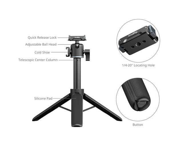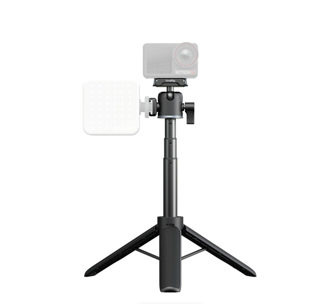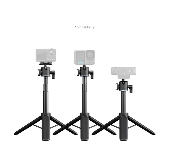 Transform your compact action camera into a versatile handheld or tripod-mounted rig with the SmallRig Telescoping Handgrip/Tripod, featuring a 4-section aluminum pole extending from 7.9 to 21.7", a collapsible mini tripod base, an adjustable ball head with 1/4"-20 screw, and a quick-release action camera clamp supporting up to 1.1 lb—ideal for GoPro HERO and DJI Action series (not recommended for Insta360 X-series due to pole visibility in 360° mode).