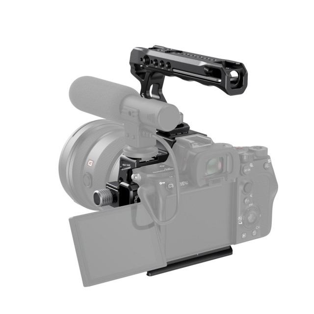 The SmallRig Half Cage Kit for Sony Alpha 7S III 3237 includes the SmallRig Half Cage 3193, the HDMI 3000 cable clamp and the ARRI 2165 adjustable top handle. The handle eases the strain on the hand when shooting at low angles and features mounting points for accessories. The cage and handle come with multiple 1/4"-20 threaded holes, ARRI 3/8"-16 locating holes available for mounting the SmallRig 2093 side handle and 2903 monitor mount, and cold shoe mounts for mounting microphones, LED lights, and the 2905 monitor mount.