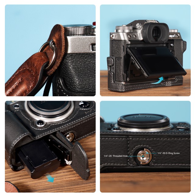SmallRig Half Case / Wrist Strap Kit for FUJIFILM X-T5 3927 is designed to protect the camera and improve the grip experience. The vintage half case, made from hard-wearing and breathable cow leather, attaches to the camera via a 1/4"-20 thumbscrew at the bottom. It maintains full access to the flip screen, button, battery door, card slot, etc. Built-in aircraft-grade aluminum alloy frame not only fits the camera perfectly but protects it from scratches and knocks, with an aluminum alloy baseplate enhancing your grip. Besides, the bottom 1/4"-20 thread allows the case to be mounted onto the tripod directly. And the wrist strap is made from cow leather and nylon to increase comfort and reliability. A complimentary shutter button helps improve touch.