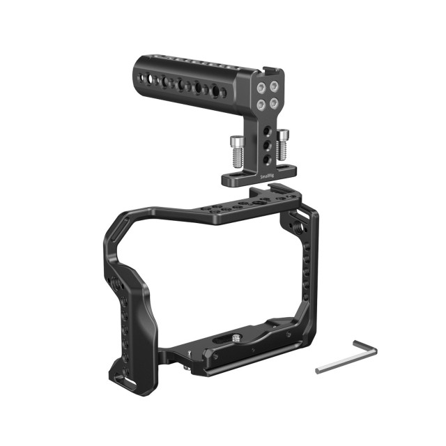 SmallRig Handheld Kit Canon EOS R 3722 is designed to facilitate low-angle shot, protect camera, and provide accessory mounts. The kit includes a full cage and a top handle. The form-fitting full cage offers a wide range of mounting points such as 1/4''-20 threaded holes, ARRI 3/8" -16 locating holes, cold shoes, NATO rail for magic arm, side handle, LED light and microphone, etc. The top handle attaches to the cage via two 1/4''-20 screws and provides a comfortable and stable low-angle shooting experience as well as such accessory mounts as 1/4''-20 threaded hole, ARRI 3/8"-16 locating holes, cold shoes that support monitor mount, magic arm and other accessories.