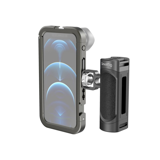 SmallRig Handheld Video Rig kit for iPhone 12 Pro 3175 is a perfect mobile phone video rig for vlogging, mobile filmmaking, commercials, etc. The kit comes with a cage specially designed for iPhone 12 Pro and a side handle for a more stable handheld phone shooting. It features two cold shoe mounts and multiple 1/4 threaded holes to attach accessories like a microphone, a LED light, a tripod, etc. It supports both horizontal shooting and vertical shooting. The lens mount on the back enables you to attach an external lens to your phone easily.