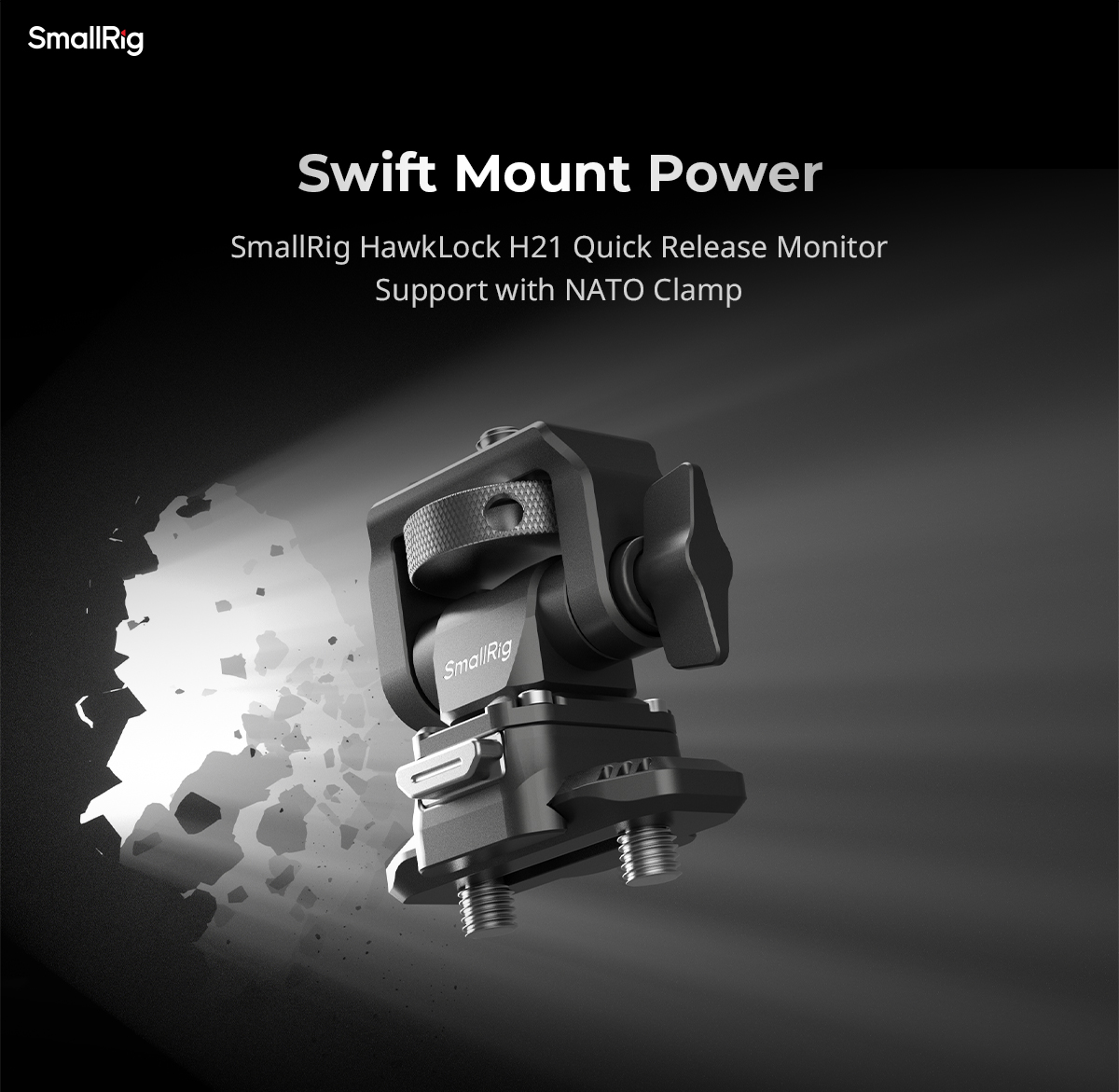 SmallRig HawkLock H21 Quick Release Monitor Support with NATO Clamp 4487 consists of a quick-release monitor mount with NATO clamp and a quick release NATO rail. Press the button to flare the pins and slide the NATO rail into the groove. Release the button to securely lock the NATO rail into the monitor mount, making the construction stable and the process…