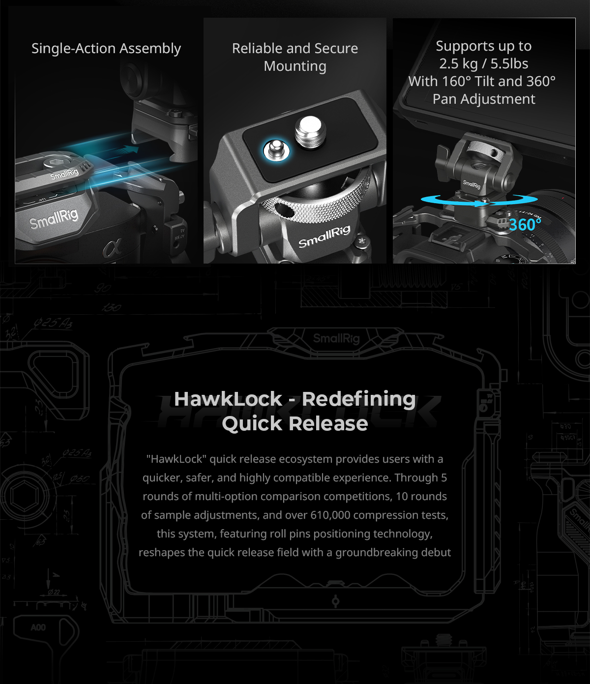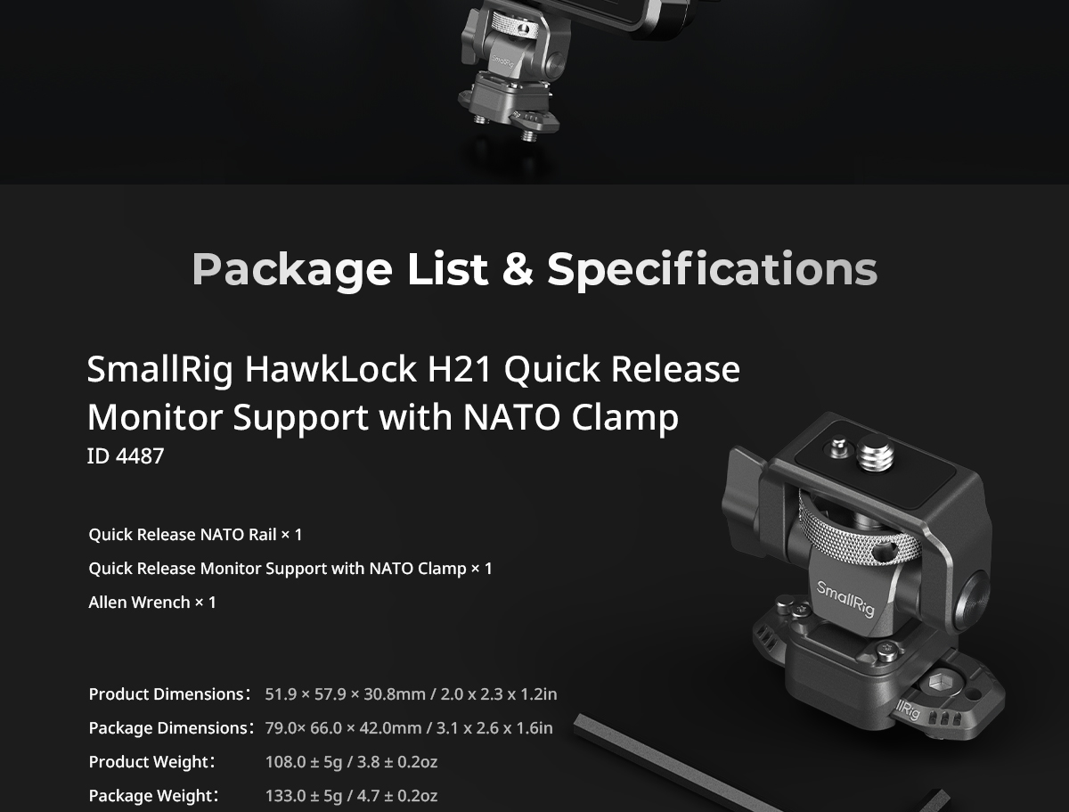 SmallRig HawkLock H21 Quick Release Monitor Support with NATO Clamp 4487 consists of a quick-release monitor mount with NATO clamp and a quick release NATO rail. Press the button to flare the pins and slide the NATO rail into the groove. Release the button to securely lock the NATO rail into the monitor mount, making the construction stable and the process time-saving. The 1/4"-20 screw on the top can be used to mount a monitor, microphone, light, or, due to the built-in spring-loaded locating pin, Ninja V / Ninja V+ monitor to prevent deflection. The item supports 160° tilt adjustment, and the tightness of the tilt axis can be quickly adjusted via the knob to better adapt to equipment of different weights. The device can hold up to 2.5kg / 5.5lb, and the attenuation is below 20% after 10,000 times tilting, making it durable. 360° swivel adjustment with horizontal axis tightness adjustment with the included hex wrench.