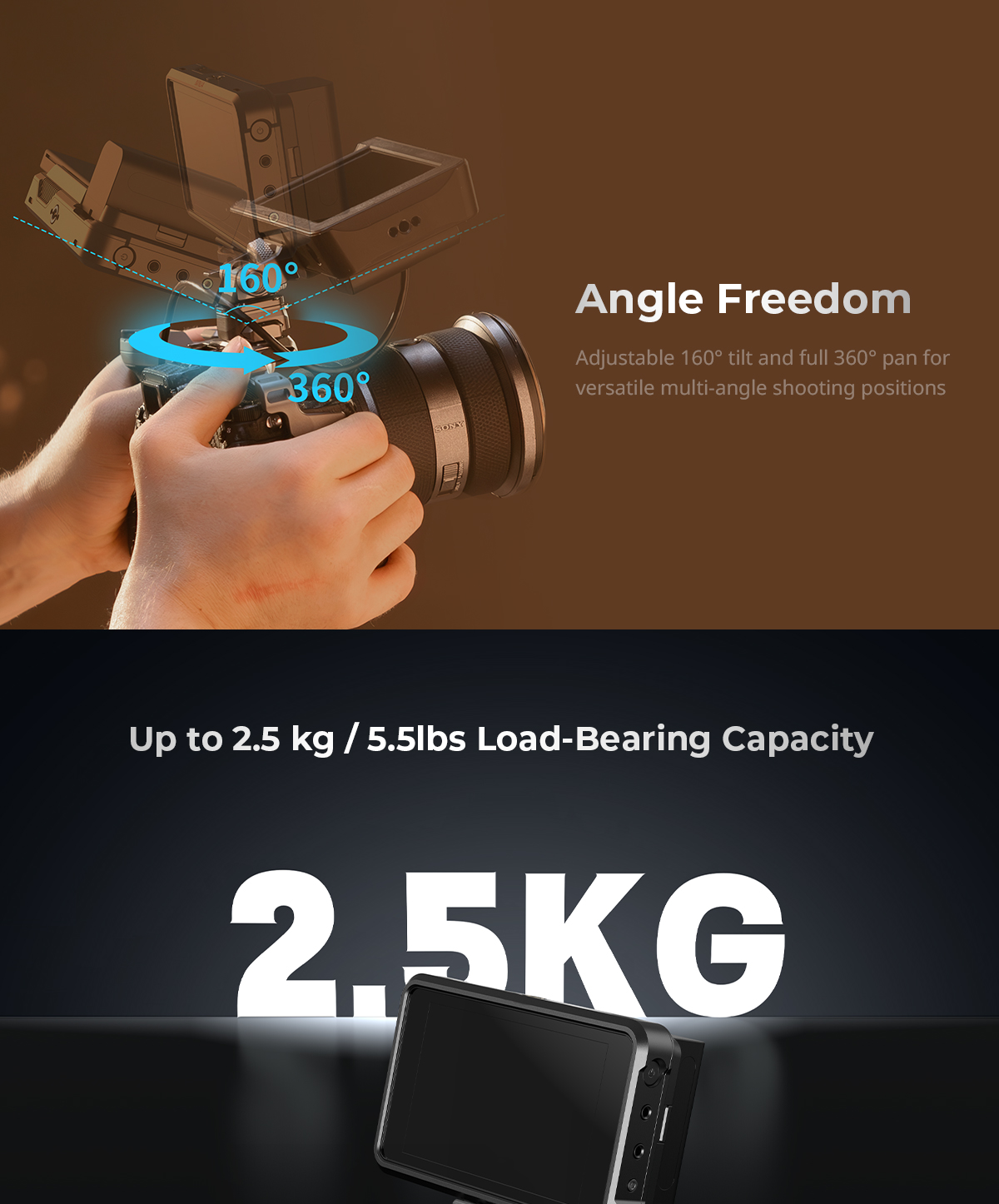 4. The device supports 160° tilt, tightness adjustment of the rotating axis, and 360° swivel for multi-angle camera or monitor positioning.