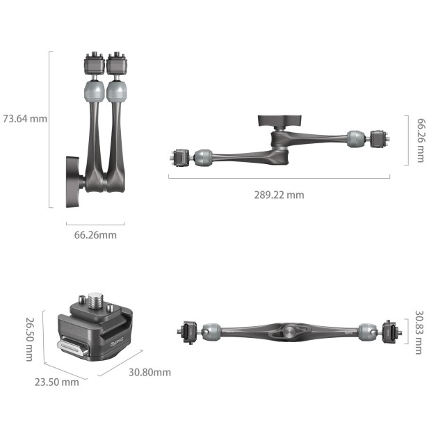 SmallRig HawkLock H21 Quick Release Rosette Magic Arm (11") 4489 is crafted from aerospace-grade aluminum alloy and stainless steel. It features an exclusive quick-release slider patented structure with inner roll pins that enable secure vertical locking. The dual-head quick-release 1/4"-20 screw design allows for external attachment of monitors, video lights, microphones, smartphones, iPads, action cameras, and more.