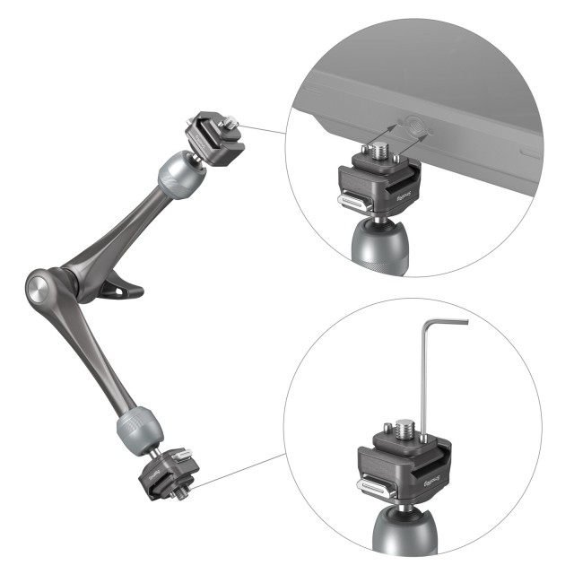 SmallRig HawkLock H21 Quick Release Rosette Magic Arm (11") 4489 is crafted from aerospace-grade aluminum alloy and stainless steel. It features an exclusive quick-release slider patented structure with inner roll pins that enable secure vertical locking. The dual-head quick-release 1/4"-20 screw design allows for external attachment of monitors, video lights, microphones, smartphones, iPads, action cameras, and more. When used with detachable pins, in conjunction with SmallRig's camera cages 4119B, 3084C, 4088B, and other monitors with matching locating holes, it effectively prevents device deviation, ensuring the safety of your equipment. The ball head offers 360-degree adjustment, ensuring smooth and flexible movements without stocking; spiral patterns on the ball head enhance friction, supporting up to 3kg / 6.6 lbs loads. A spring has been added to the stainless steel rosette joint for smoother angle adjustments. The anti-skid design of the thumb lever incorporates thrust bearings for a comfortable, ergonomic grip, allowing for easy locking of the magic arm and ball head with a single press. CNC machined for durability, the unit includes padding on both mounts to prevent scratching of equipment.