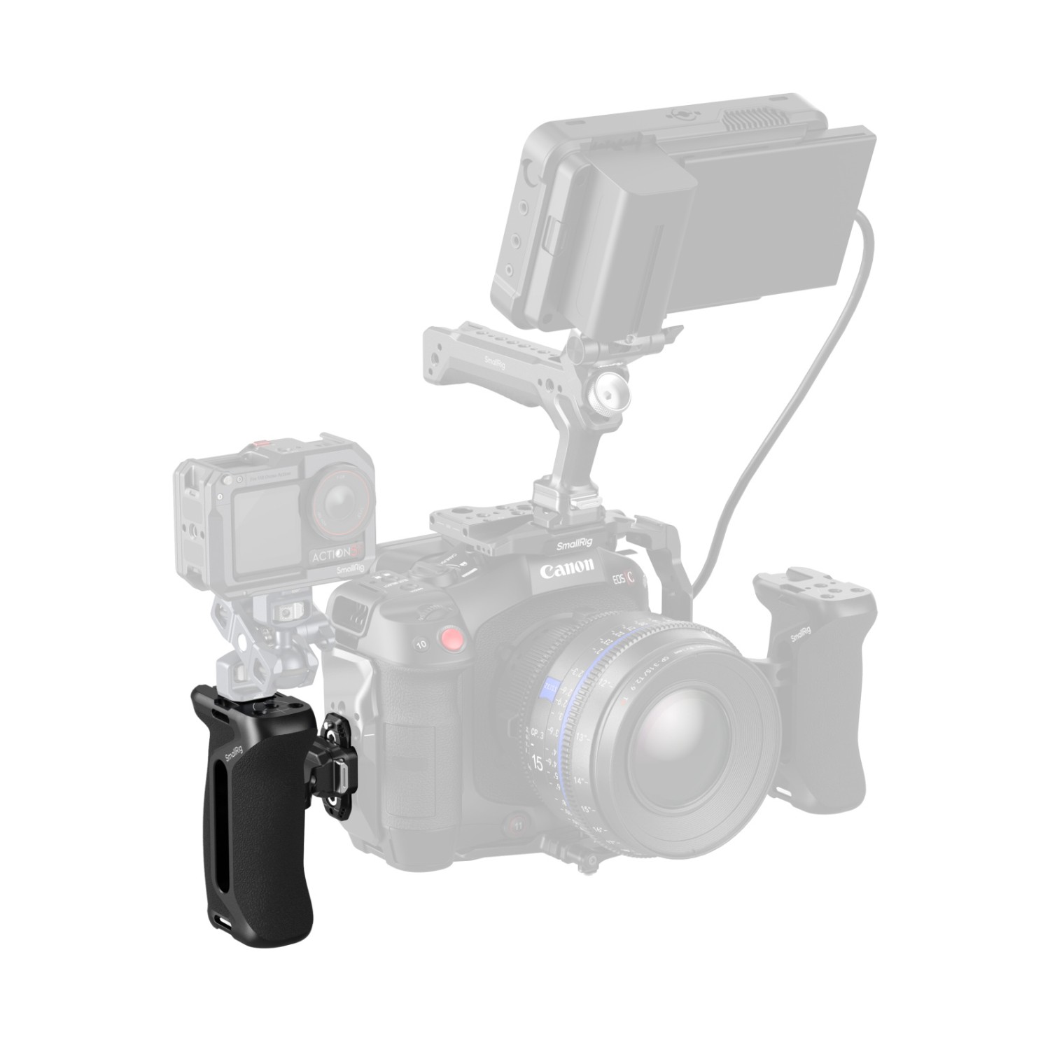 Featuring a patented quick release NATO rail mechanism, the handle self-locks with a single press for rapid and secure mounting and dismounting. It optimizes weight distribution by offsetting some lens weight, resulting in steadier handheld shots without interfering with LCD flip-out operation, allowing for effortless monitoring.