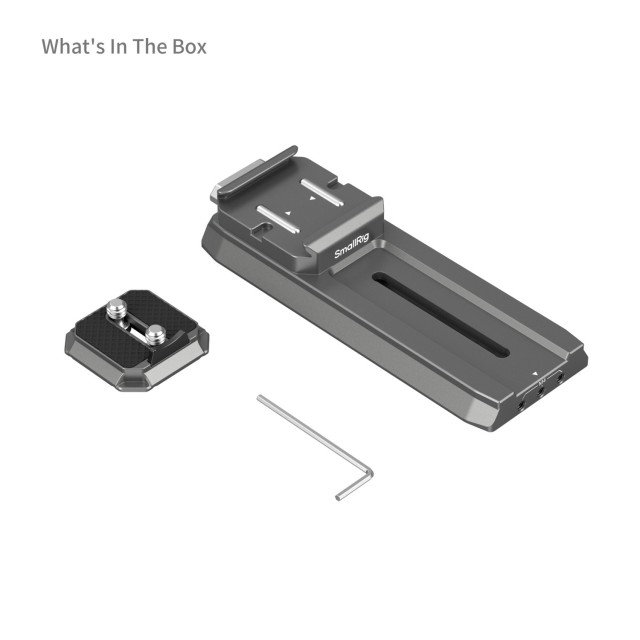 SmallRig HawkLock H38 Manfrotto Quick Release Plate for DJI Stabilizers 4638 is specifically designed for DJI RS 2 / RSC 2 / RS3 / RS 3 Pro / RS 4 / RS 4 Pro stabilizers, enabling swift transitions between tripod and stabilizer setups, thus optimizing user filming time. The quick-release plate adheres to Manfrotto standards, featuring a tool-free quick-release design. Internally, the Arca-Swiss quick-release baseplate features an adjustable anti-slip design. It facilitates the quick installation of the cages (ID 4481) and incorporates a gear rail at the bottom for precise front-to-back sliding adjustments.