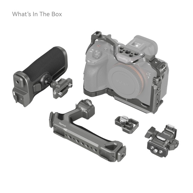 SmallRig HawkLock Quick Release Advanced Cage Kit for Sony Alpha 7R V / Alpha 7 IV / Alpha 7S III 4539 is designed for easy disassembly when shooting handheld, reducing the burden on the arm to enhance stability, while offering a wide range of accessory mounts. The kit includes a cage, HDMI cable clamp, top handle, rotating side handle, and a monitor mount. The patented self-developed quick-release design (named HawkLock) covers the cold shoe, NATO rails, and Arca quick-release plate *1, which is stable without any false position, with one push to load, release to lock, and smooth sliding in to improve the disassembly and assembly efficiency; the monitor and the monitor mount, the monitor mount and the top handle, the top handle and the cage, and the side handle and the cage, all of which are quick-release to realize quick-release disassembly and assembly. Cold shoe, NATO rails, and Arca quick-release plate are compatible with the traditional cold shoe, NATO clamp, and Arca-Swiss clamp, saving money and worry. The monitor mount supports 180° tilt and 360° horizontal adjustment, comfortable to watch at any angle; the top handheld is ergonomically designed for comfortable grip, convenient for kit handling and low-angle shooting; the swivel side handle supports step-less rotation by pressing down, and the angle change still maintains a comfortable grip; the HDMI cable clamp protects the interface for more stable signal transmission; the cage adopts a three-point locking design, stable and not shaking. The bottom of the cage and the bottom of the side handle have built-in disassembly tools, which are easy to take out and use as you go, so it is easy to disassemble quickly. The kit has built-in 1/4"-20 threaded holes, ARRI 3/8" -16 locating holes, cold shoes, NATO rails, QD sockets, and strap holes, making it easy to expand a variety of accessories for creative endeavors.