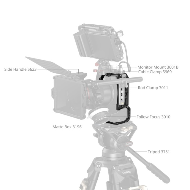 Additionally, the bottom Arca-Swiss quick release plate enables direct mounting onto Arca-type tripods (ID 4060, 4353) and DJI RS 2, RSC 2, RS 3, RS 3 Pro, RS 4, and RS 4 Pro gimbals, facilitating seamless transitions between handheld, tripod, and gimbal setups. A double-headed wrench is conveniently stored at the base for easy assembly.