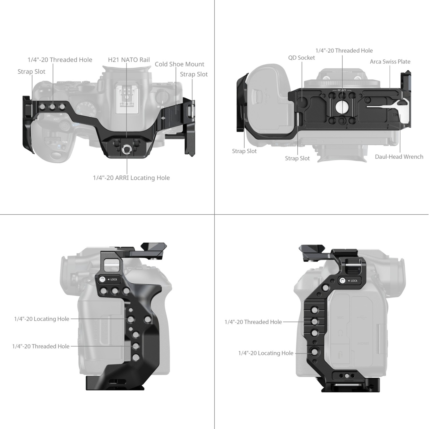 SmallRig "HawkLock" Quick Release Cage for Canon EOS R6 Mark III / R6 Mark II 5954 provides robust protection and extensive mounting options for professional shooting. The cage securely attaches to the camera using a bottom 1/4"-20 screw and dual side locating blocks, while multiple silicone pads prevent scratches and ensure a snug fit. It maintains full access to buttons, card slots, the flip screen, and the battery compartment.