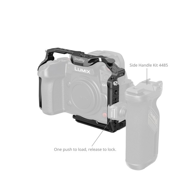 SmallRig HawkLock Quick Release Cage for Panasonic LUMIX GH7 / GH6 4824 is designed to provide accessory mounts and protect the camera. The patented self-developed quick-release structure (named HawkLock) covers cold shoes, NATO rail, and arca swiss, which is used with HawkLock eco-accessories to realize solid and no false position, one push to load, release to lock, and improve the disassembly efficiency. It locks the camera via one 1/4"-20 screw and the two M2.5 screws on both sides. Built-in all-around protective spacers prevent the camera from being scratched.