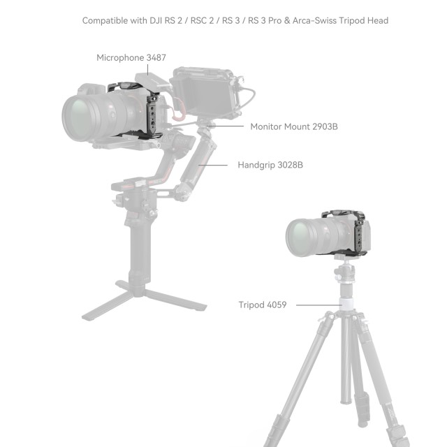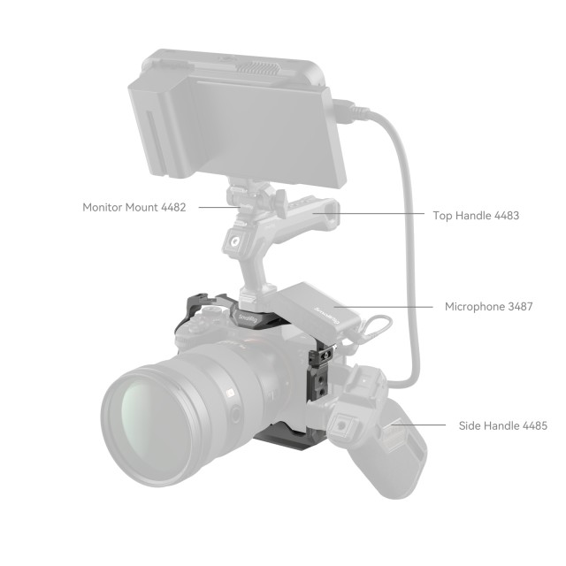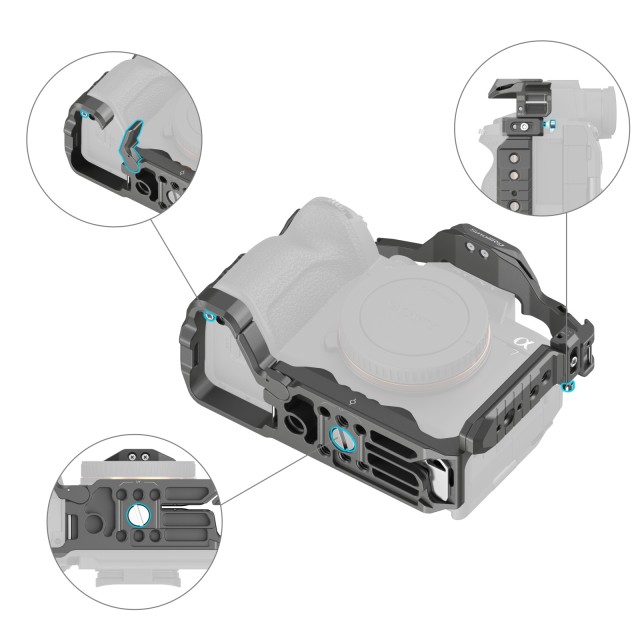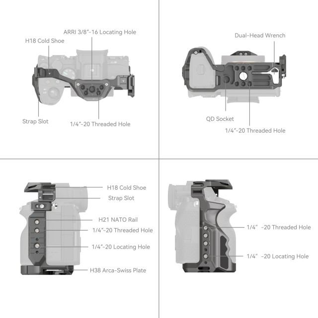 SmallRig HawkLock Quick Release Cage for Sony Alpha 7R V / Alpha 7 IV / Alpha 7S III / Alpha 1 / Alpha 7R IV 4481 is designed to provide accessory mounts and protect the camera. The patented self-developed quick-release structure (named HawkLock) covers cold shoes, NATO rail, and arca swiss, which is used with HawkLock eco-accessories to realize solid and no false position, one push to load, release to lock and improve the disassembly efficiency. It locks the camera via one bottom locating pin, one 1/4"-20 screw, and one M2.5 screw on the left side. The side lock adapters need to be adjusted in the installation direction to fit different camera types, printed with “A7 IV” is for Alpha 7 IV and Alpha 7R V while printed with “A7S III” is for Alpha 7S III / Alpha 1 / Alpha 7R IV. Built-in all-around protective spacers prevent the camera from being scratched. The cage gives access to interfaces, dials, buttons, or battery doors. There is a spindle spanner in the battery compartment which fits the camera curve and leaves room for a little finger for a comfortable grip. 1/4"-20 threaded holes, ARRI 3/8" -16 locating holes and HawkLock cold shoe mounts support top handle 2165C, side handle 2093, monitor mount 2903, microphones, LED lights, monitors, etc. The bottom QD socket supports the QD shoulder strap. HawkLock Arca-Swiss quick-release plate at the bottom is compatible with DJI RS 2 / RSC 2 / RS 3 / RS 3 Pro, the quick-release plate (riser plate) of DJI RS 2/RSC 2 stabilizer for stabilizer shooting, and the Arca-Swiss quick release plate 3154. Holes on the sides and bottom of the cage allow attaching such accessories as hand strap PAC2456. Besides, the cage comes with a built-in magnetic spanner that facilitates disassembly and assembly.